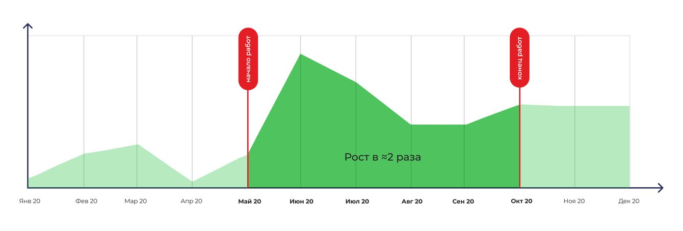 График №1. Рост поискового трафика в период нашего продвижения (май 2020 — октябрь 2020) в ≈2 раза: