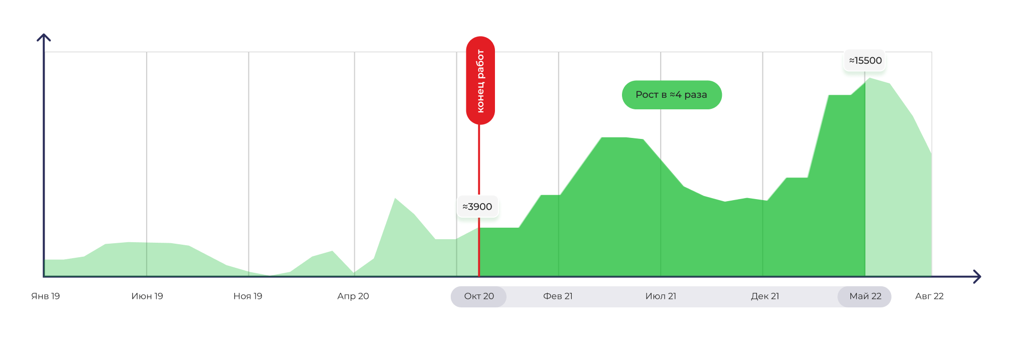 После прекращения работы над сайтом рост продолжился даже без правок: сайт не трогали и не наполняли. Оцените рост посещаемости сайта в ≈4 раза с октября 2020 (окончание работ) по май 2022 года (График № 3).
