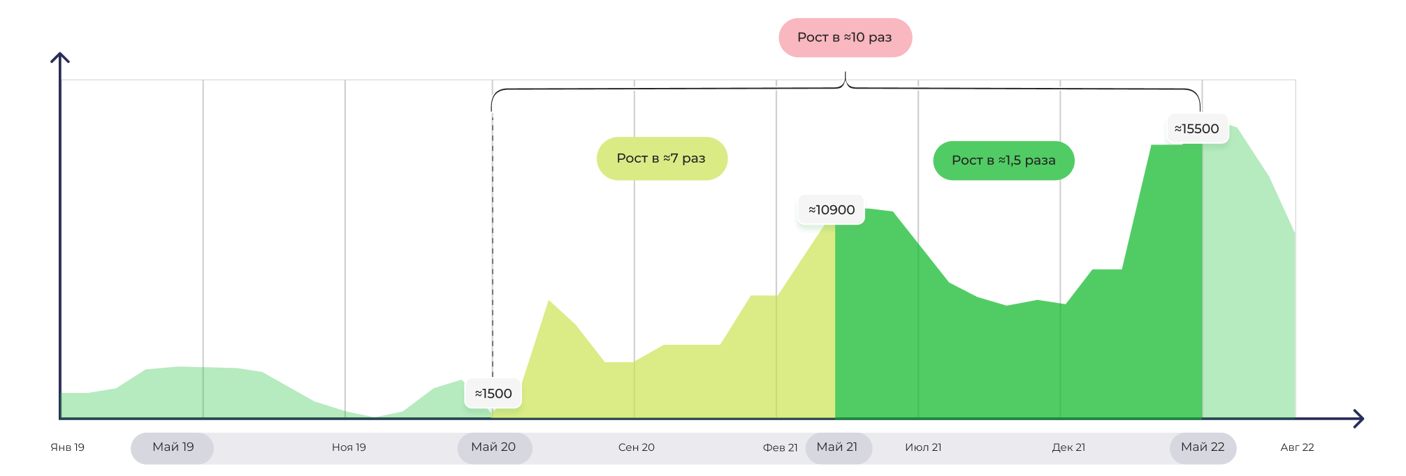 График № 2. Рост поискового трафика с начала нашего продвижения ≈в 10 раз. Сравниваем май 2020 года с маем 2022 года: