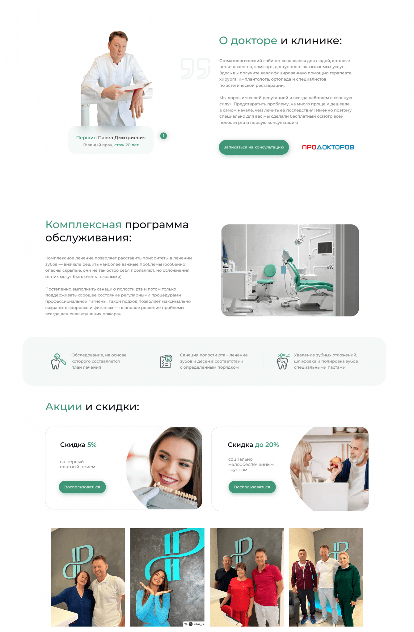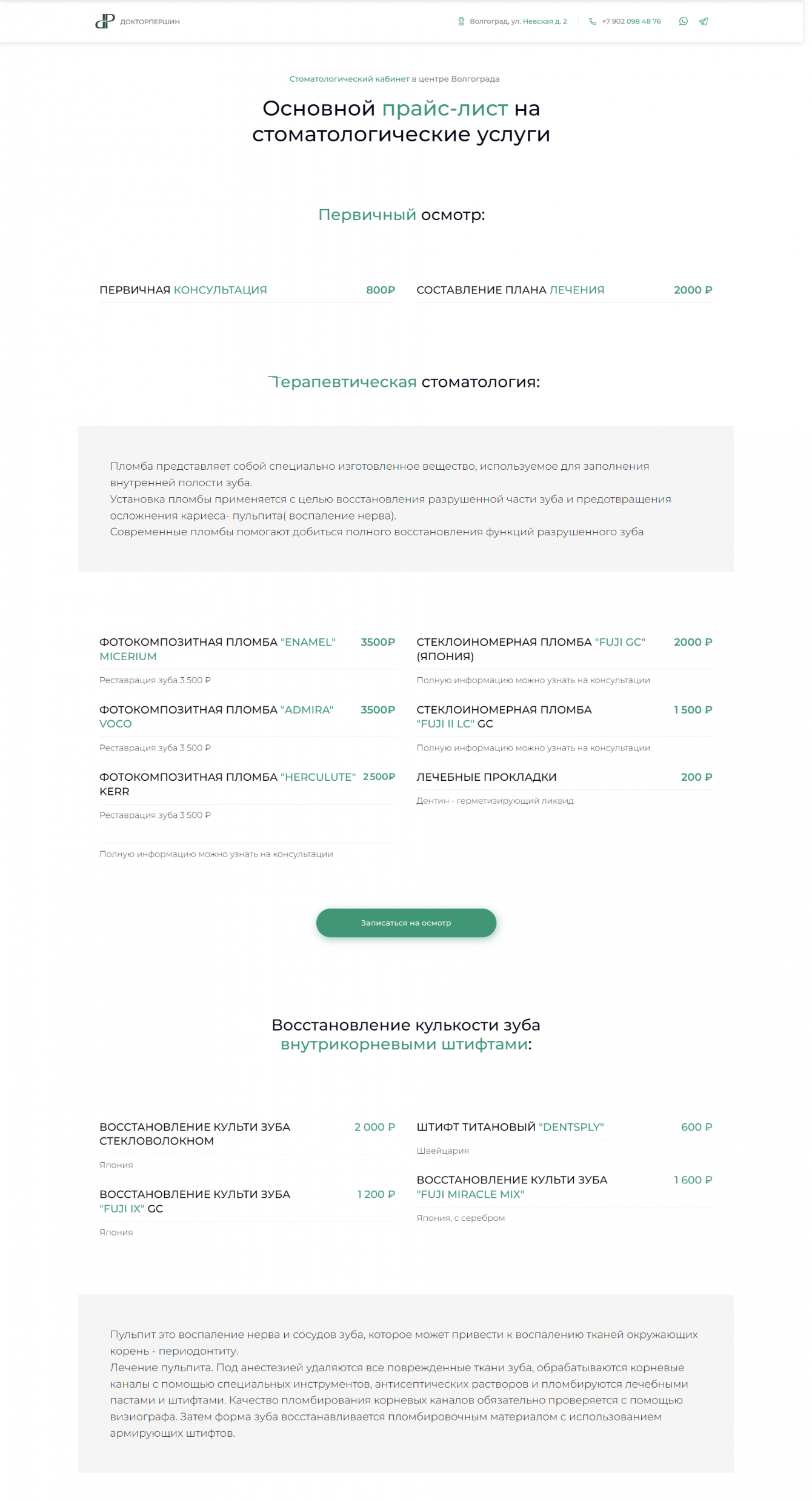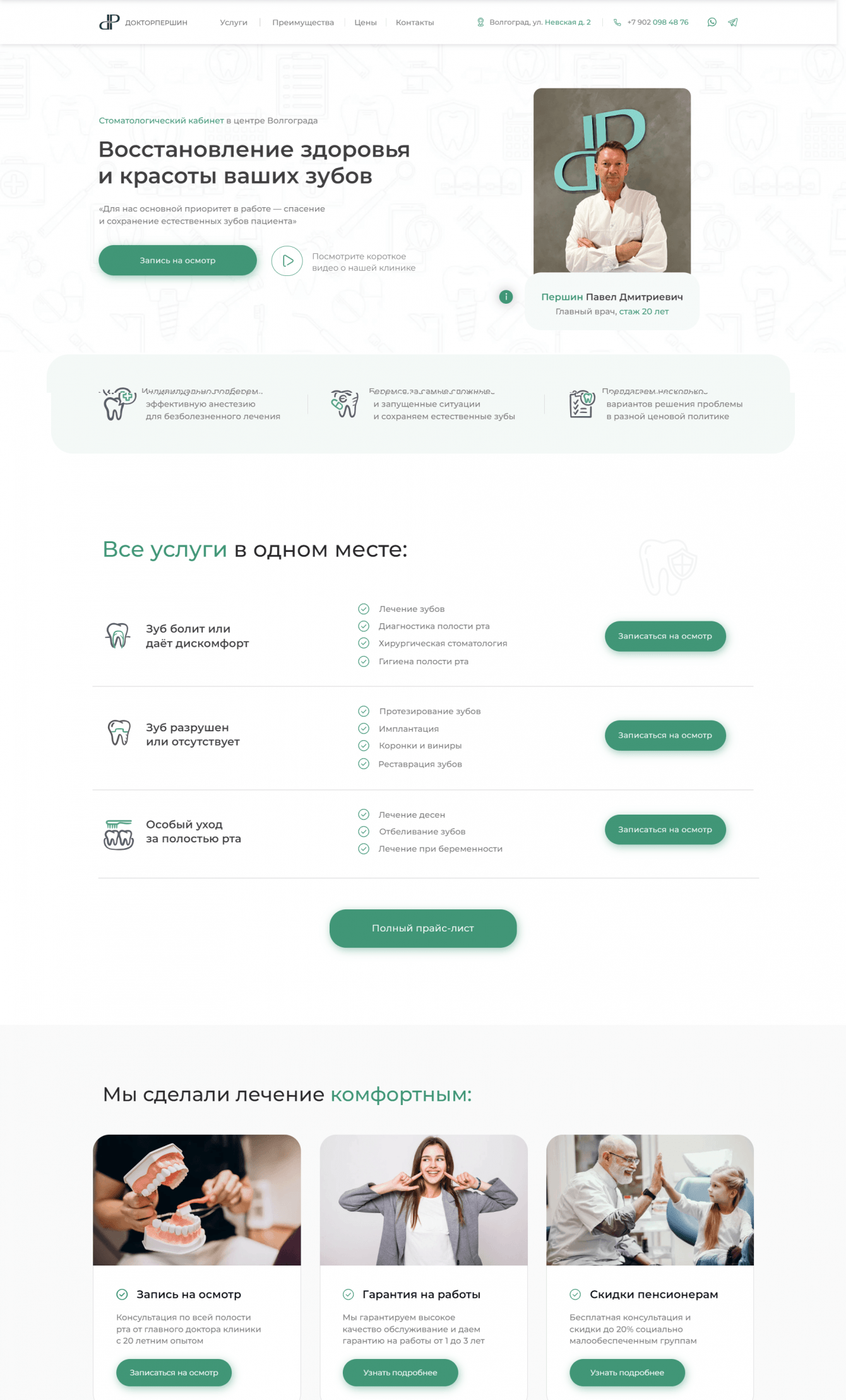 Рассказали про виды услуг, преимущества, обозначили географию места и предвосхитили вопросы клиентов. На примере показали уровень мастерства доктора Першина