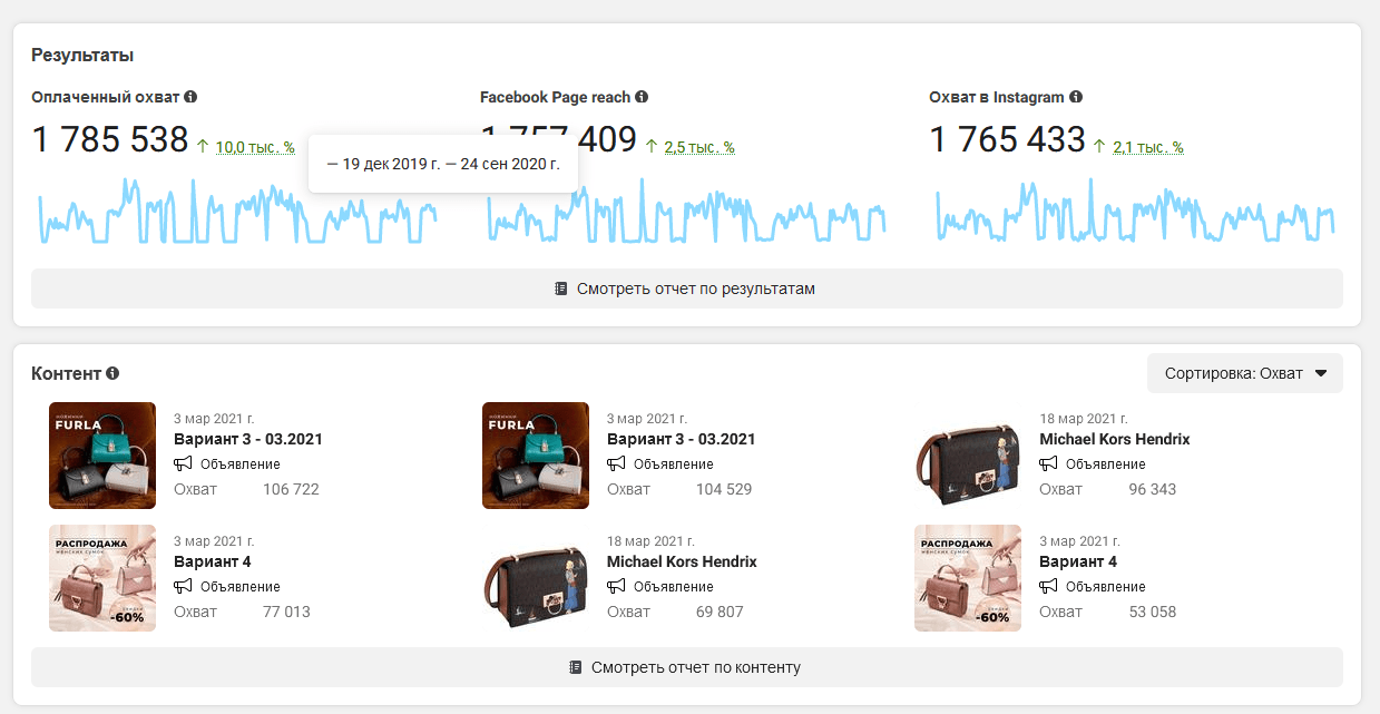 Запустили таргетированную рекламу с креативами на самые прибыльные позиции — женские сумки Chatte, Furla, Michael Kors и другие премиальные продукты.