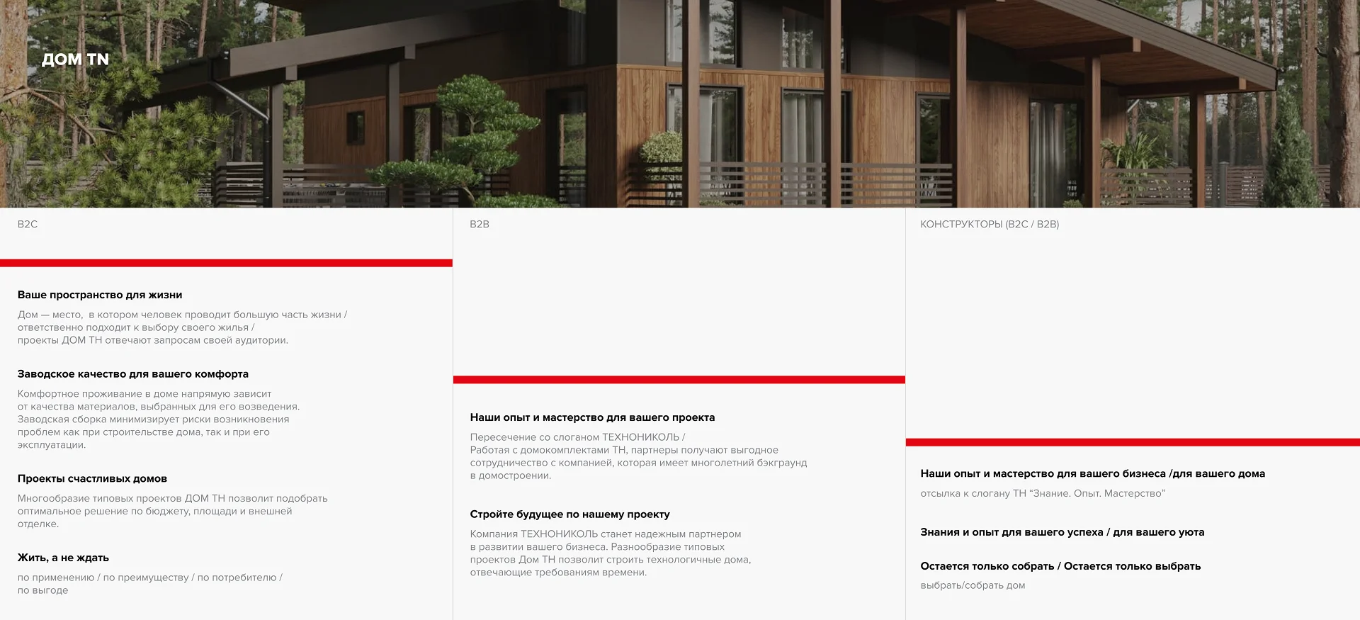 УТП было сформулировано вокруг ключевого преимущества: «Дом, в котором каждая деталь просчитана. Технологии ТЕХНОНИКОЛЬ для вашей уверенности». Для B2C это смещало акцент с процесса строительства на гарантированный результат, для B2B — подчеркивало системность и соответствие стандартам.