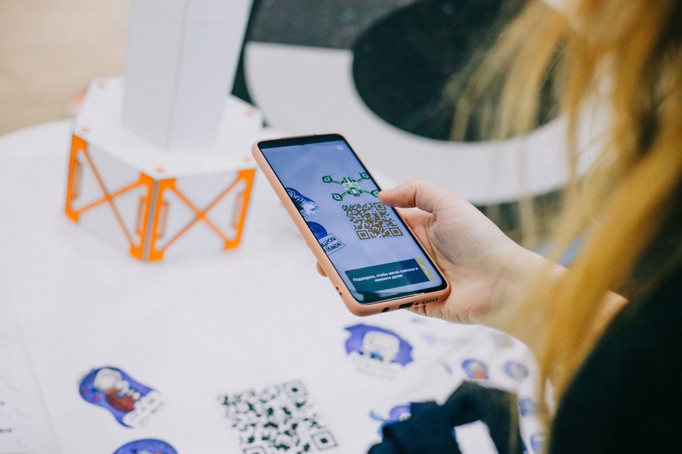 Пользователь сканирует специальную метку на плоскости перед ветряком, которая помогает позиционировать дрона в пространстве. Затем на экране появляется 3D-модель дрона на месте этой метки, которая постепенно поднимается вверх к лопастям ветряка.
