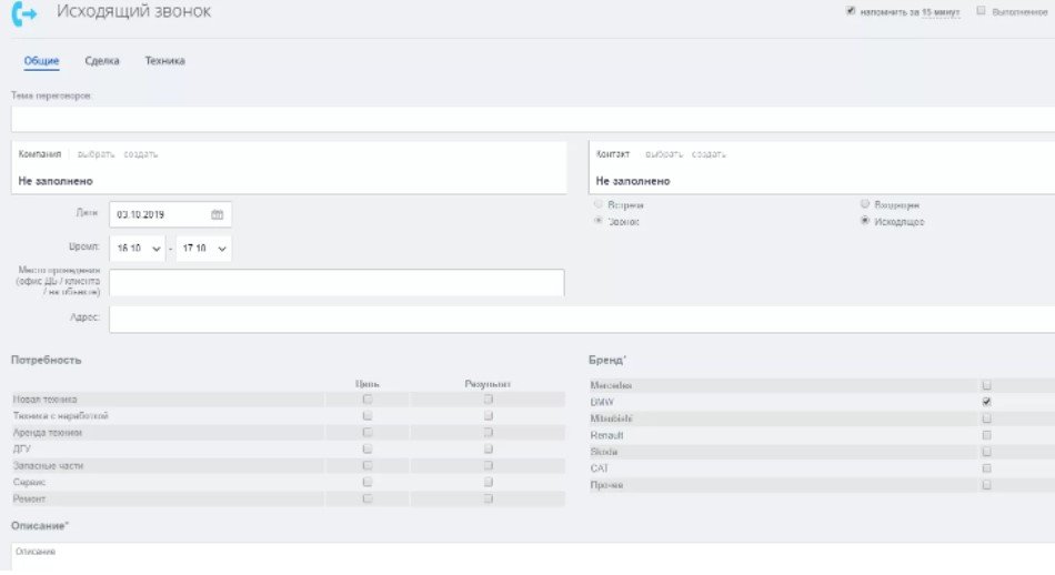 Мы переработали внешний вид и стандартный функционал карточки “дела” в Битрикс24. Теперь в каждом звонке/встрече менеджер обязан указать результат и важную для информацию, например, бренд, которым интересуется покупатель, состояние парка техники, оборудование, которому требуется сервис.