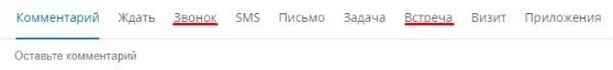 Для звонка есть возможность указать какой тип звонка планируется, исходящий или входящий, а для встречи указание места проведения встречи. Это может быть как переговорка, так и офис клиента.