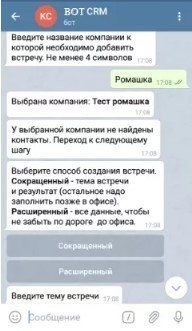 Казалось бы, что на этом всё, но, помимо этого, мы сумели реализовать ещё одну не менее интересную «фишку». Теперь создать такое событие можно не только через веб-версию Битрикс24, но и через чат-бота Телеграм. Просто отправляем сообщение боту «встреча» или «звонок» и бот начинает задавать уточняющие вопросы, на основании которых заполнит поля в карточке дела и создаст его в Битрикс24!