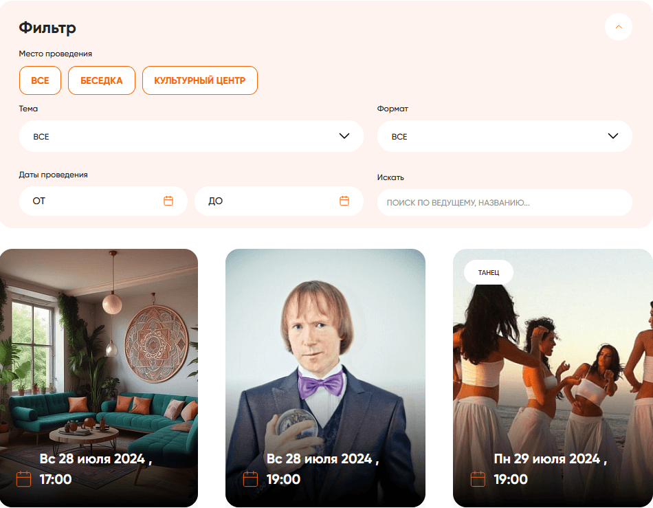 -фильтр по мероприятиям (Позволяет делать выборку по наиболее актуальным полям мероприятий: клиенты зачастую интересуются конкретной тематикой или понравившимся ведущим. Все поля выборки хранятся в CMS, сам компонент настроен на “нативную” работу с Битриксом.)