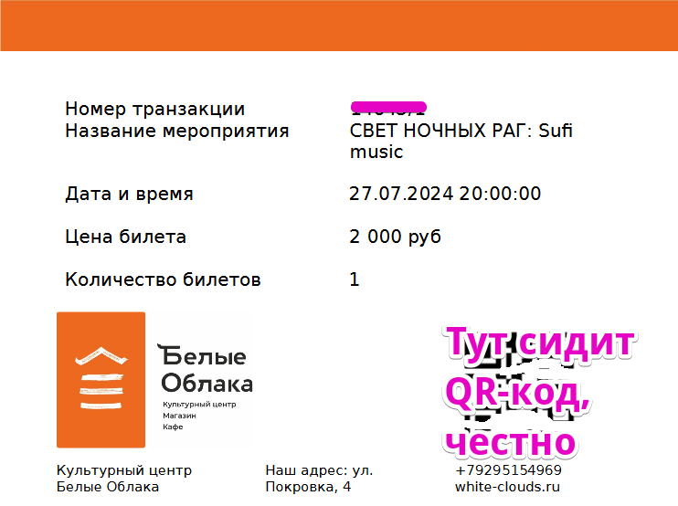 Когда клиент оплачивает билет на мероприятие - разумеется, ему на почту должен отправляться сам билет, весь такой брендированный, да с QR-кодом для сканирования на входе.