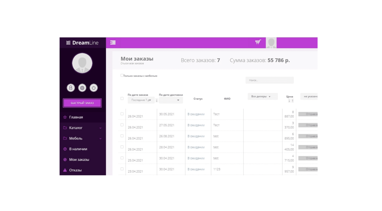 В разделе «Мои заказы» Дилер может детально изучить каждый оформленный и переданный в производство заказ. В колонках есть статус заказа, ФИО покупателя, цена, дата оформления заказа и доставки.
