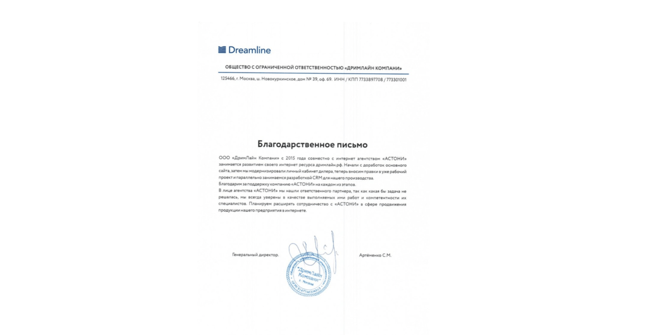 ООО "ДримЛайн Компани" с 2015 года совместно с интернет агентством "АСТОНИА" занимается развитием своего интернет ресурса дримлайн.рф. начали с доработок основного сайта, затем мы модернизировали личный кабинет дилера, теперь вносим правки в уже рабочий проект и параллельно занимаемся разработкой CRM для нашего производства.