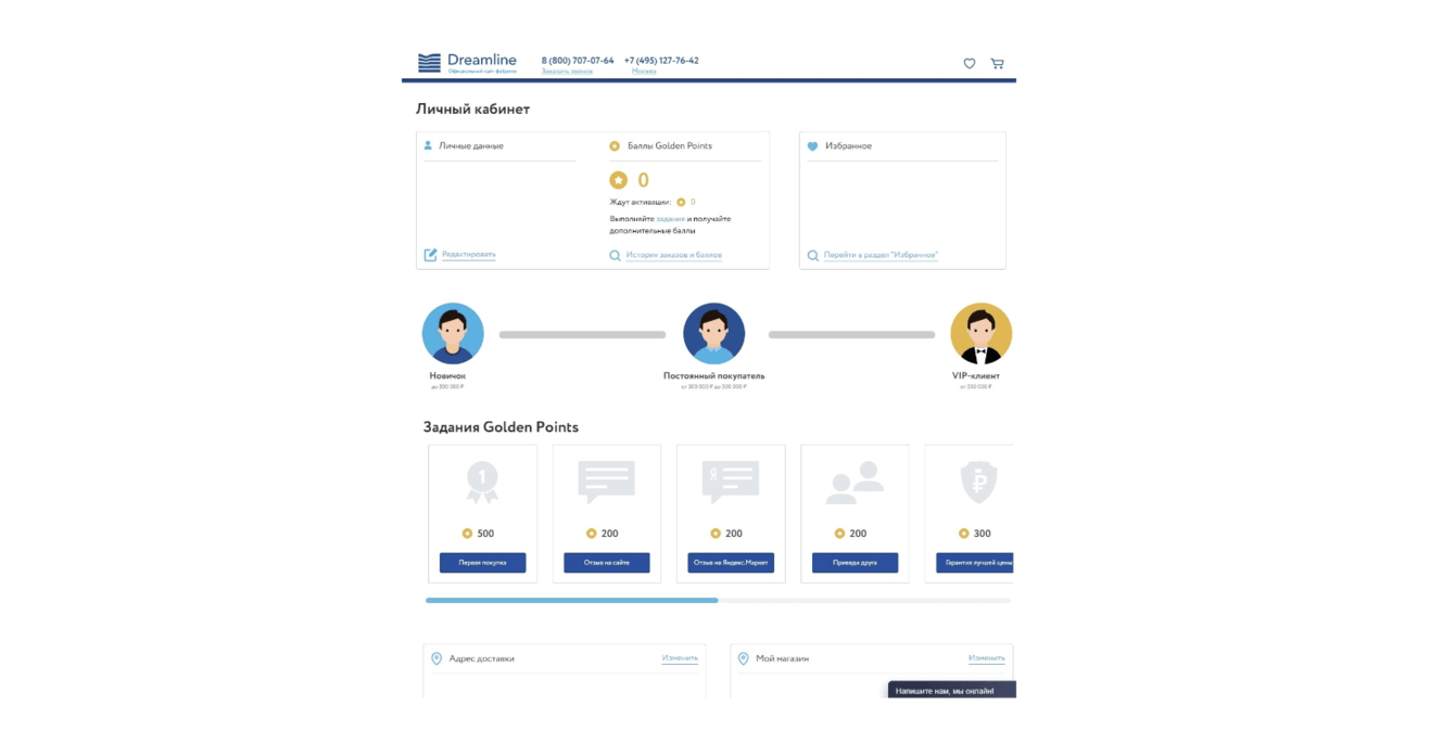 Компания обратилась к нам за созданием личного кабинета. Поскольку товары «Дримлайн» продают больше полутора тысяч партнеров, каждому из них нужна простая и логичная система учета. Проще всего в этом случае подготовить единую систему авторизации с возможностью работы в личном кабинете.