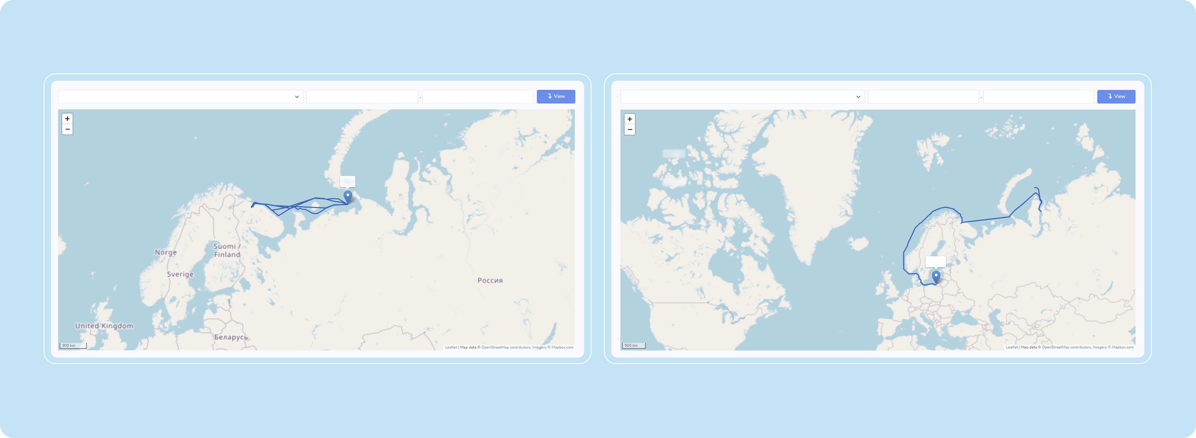 Данные о положении собираются с навигационного устройства каждого судна и передаются в базу офисной версии приложения для хранения и анализа.