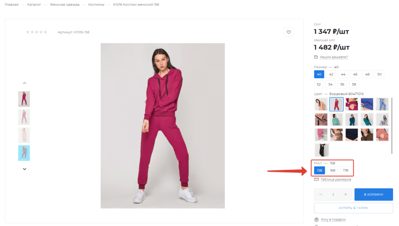 • настроили функционал так, чтобы выбор роста был аналогичен выбору торгового предложения по цвету и размеру.