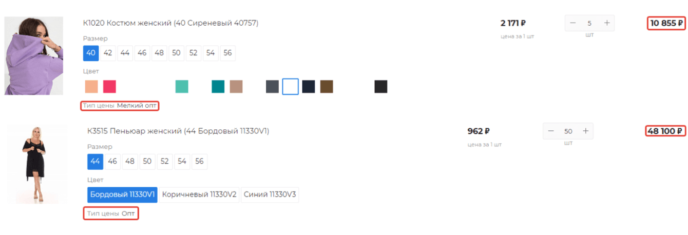 Настроили работу мелкооптовой цены при заказе на сумму до 30.000 рублей и крупнооптовой при покупке свыше 30.000 рублей.