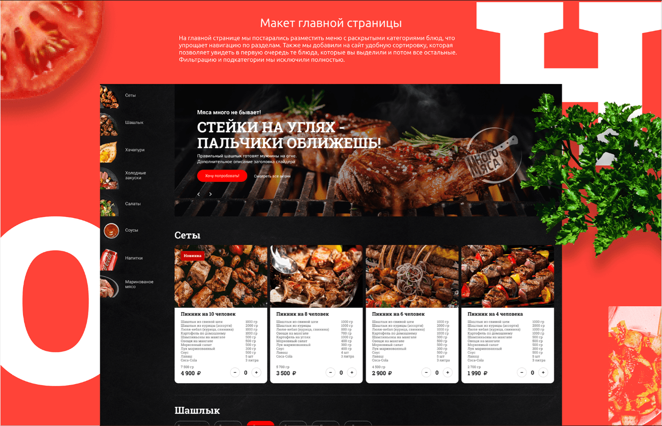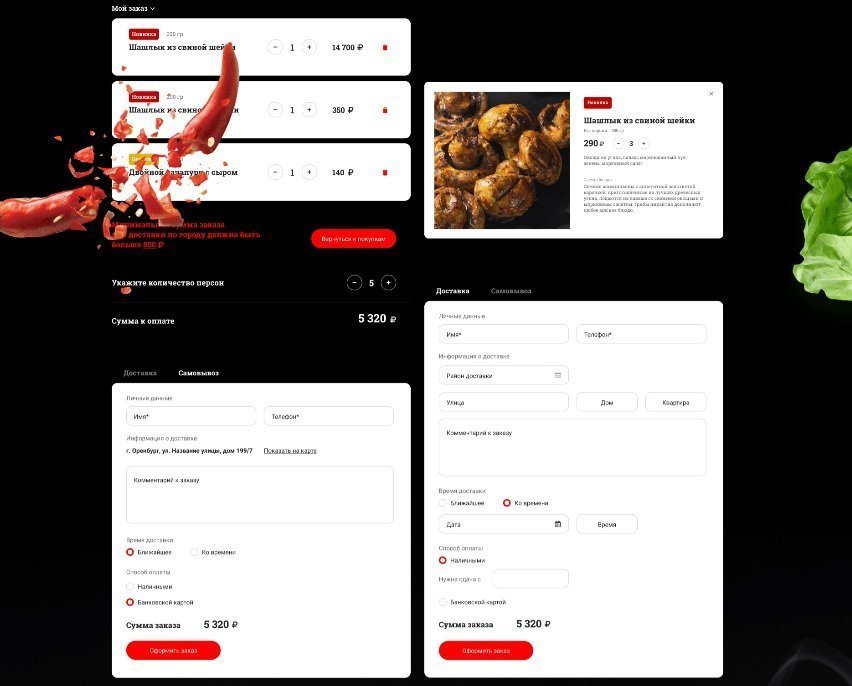 Задача: разработать сайт доставки, с возможностью оплаты онлайн. Основным пожеланием от клиента было использование темной цветовой гаммы (черный, красный цвета) и яркие акценты, а также качественных фотографий блюд из ассортимента.