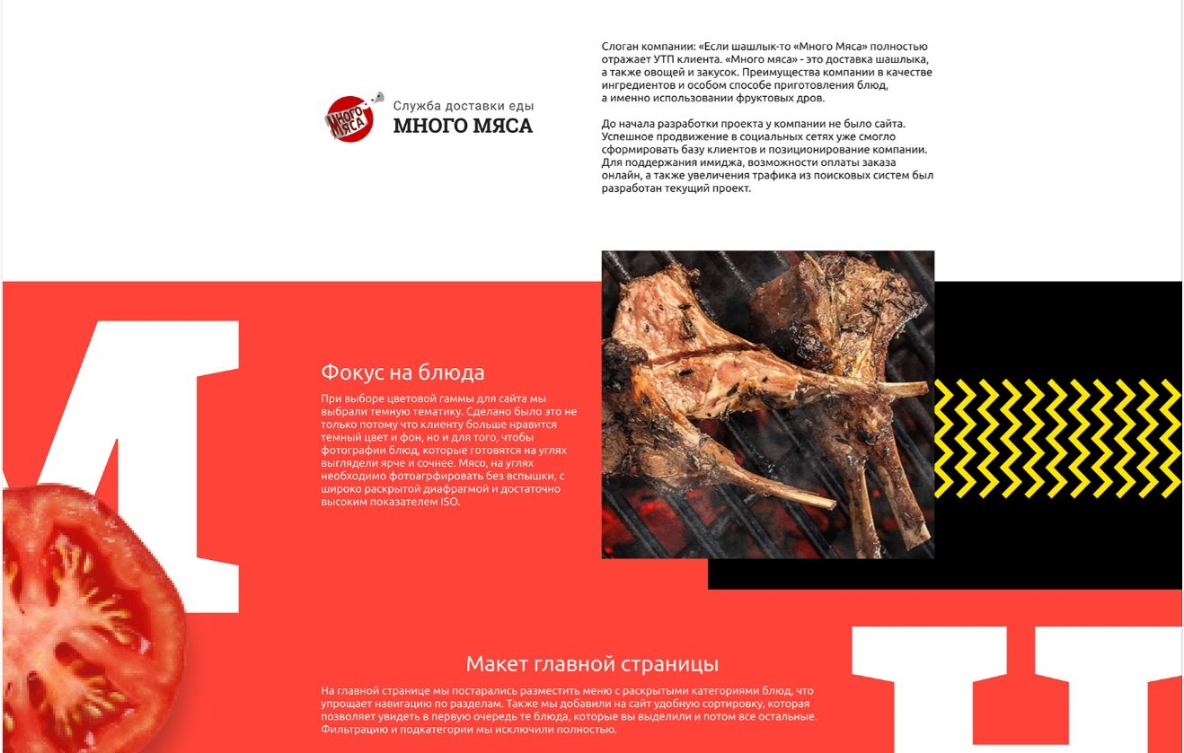 Слоган компании: «Если шашлык-то «Много Мяса» полностью отражает УТП клиента. «Много мяса» - это доставка готовых блюд из мяса, шашлыка, а также овощей и закусок. Преимущества компании в качестве ингредиентов и особом способе приготовления блюд, а именно использовании фруктовых дров.