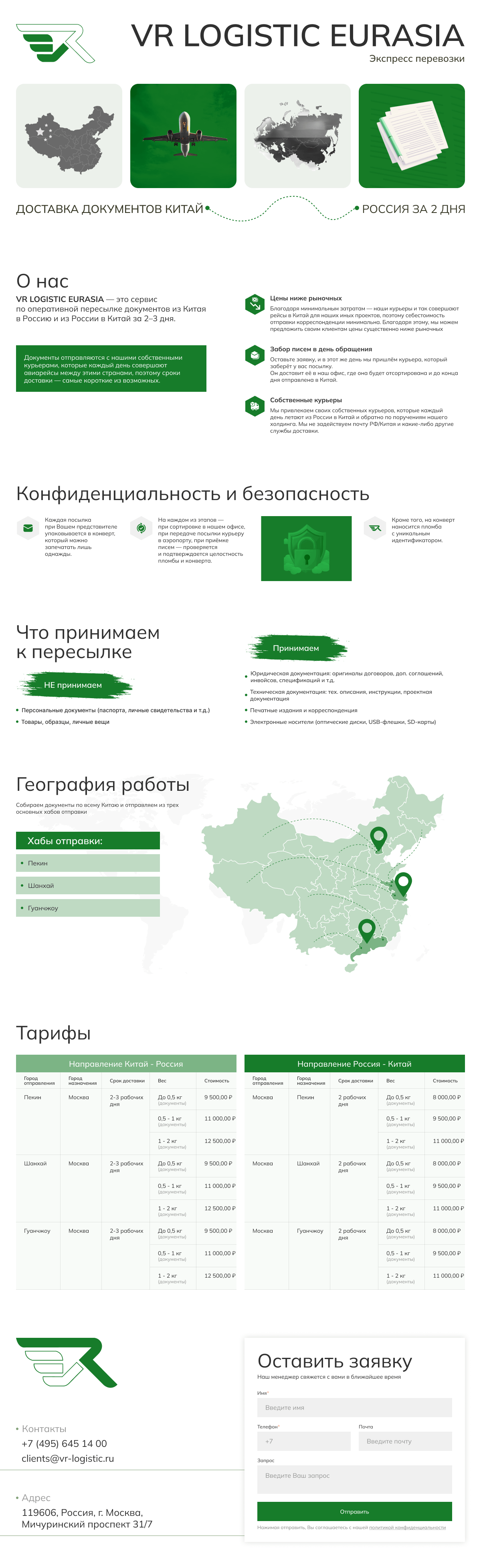Создать простой и понятный лендинг для сервиса VR EXPRESS, который объясняет преимущества быстрой, безопасной и выгодной доставки документов между Китаем и Россией. Сделать адаптивный дизайн, удобную структуру с акцентом на доверие и удобную форму заявки на платформе Tilda.