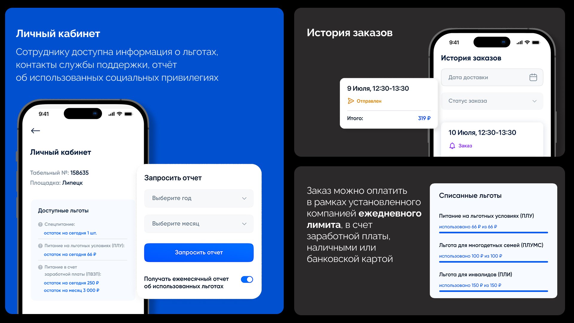 В личном кабинете сотруднику доступна информация о льготах, контакты службы поддержки, отчет об использованных социальных привилегиях. Также можно указать контактные данные для связи. Приложение позволяет следить за историей заказов, изменять или отменять заказы, а также оценивать качество питания.