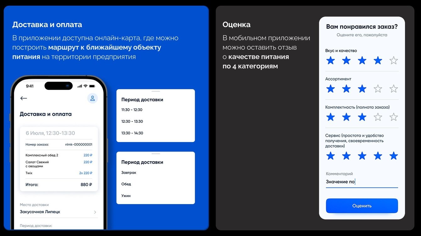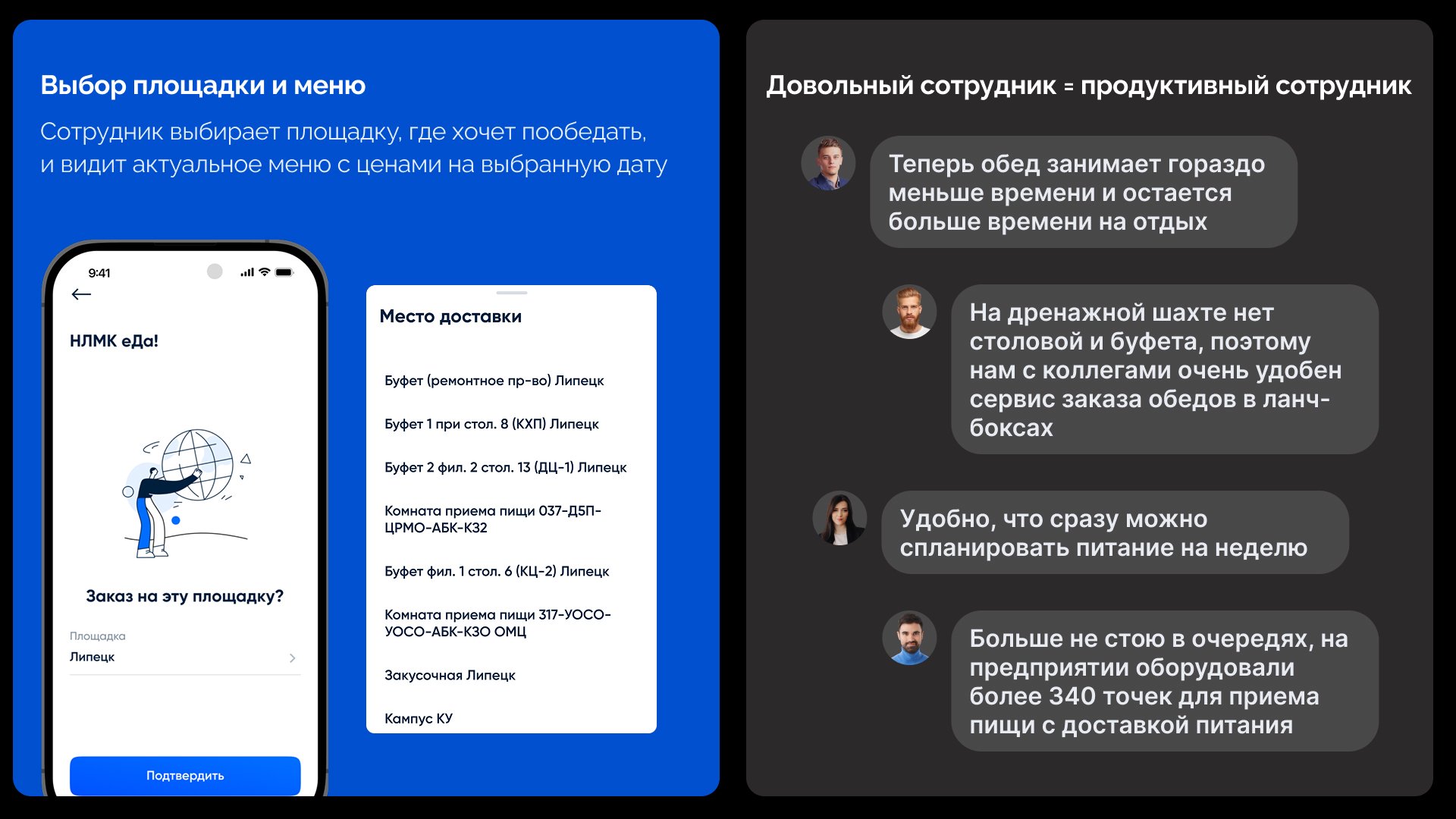 В приложении НЛМК еДА процесс работы схож с популярными сервисами доставки еды, что минимизировало необходимость обучения и снизило нагрузку на команду, ответственную за внедрение приложения.