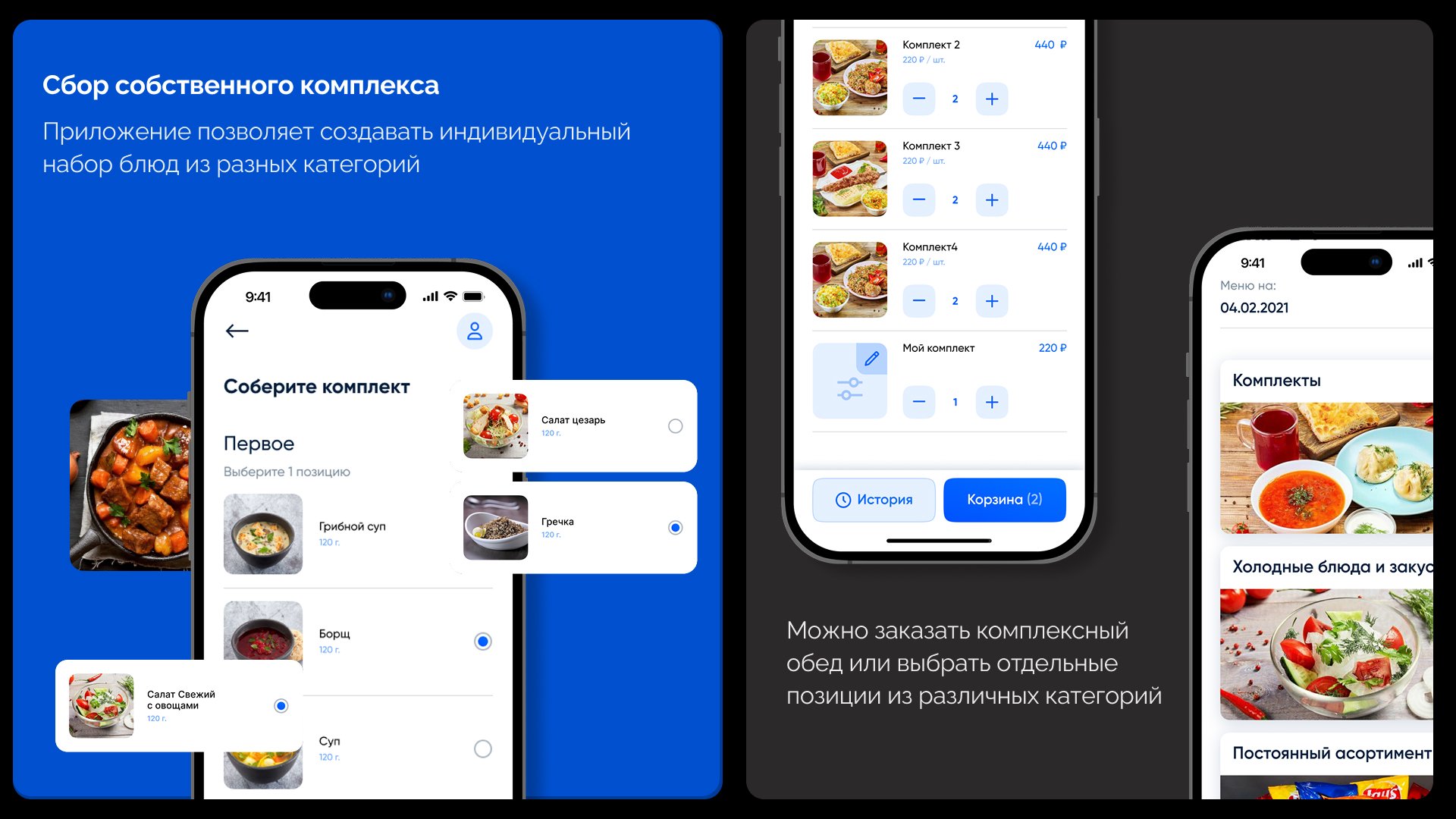 Приложение стало полноценной системой, которая предоставляет сотрудникам холдинга полный контроль над их питанием. Работник выбирает площадку, где хочет пообедать и видит актуальное меню с ценами на выбранную дату. Можно заказать комплексный обед или выбрать отдельные позиции из различных категорий, включая «Комплекты», «Холодные блюда и закуски», «Первое», «Горячее», «Гарниры», «Салаты», «Напитки».