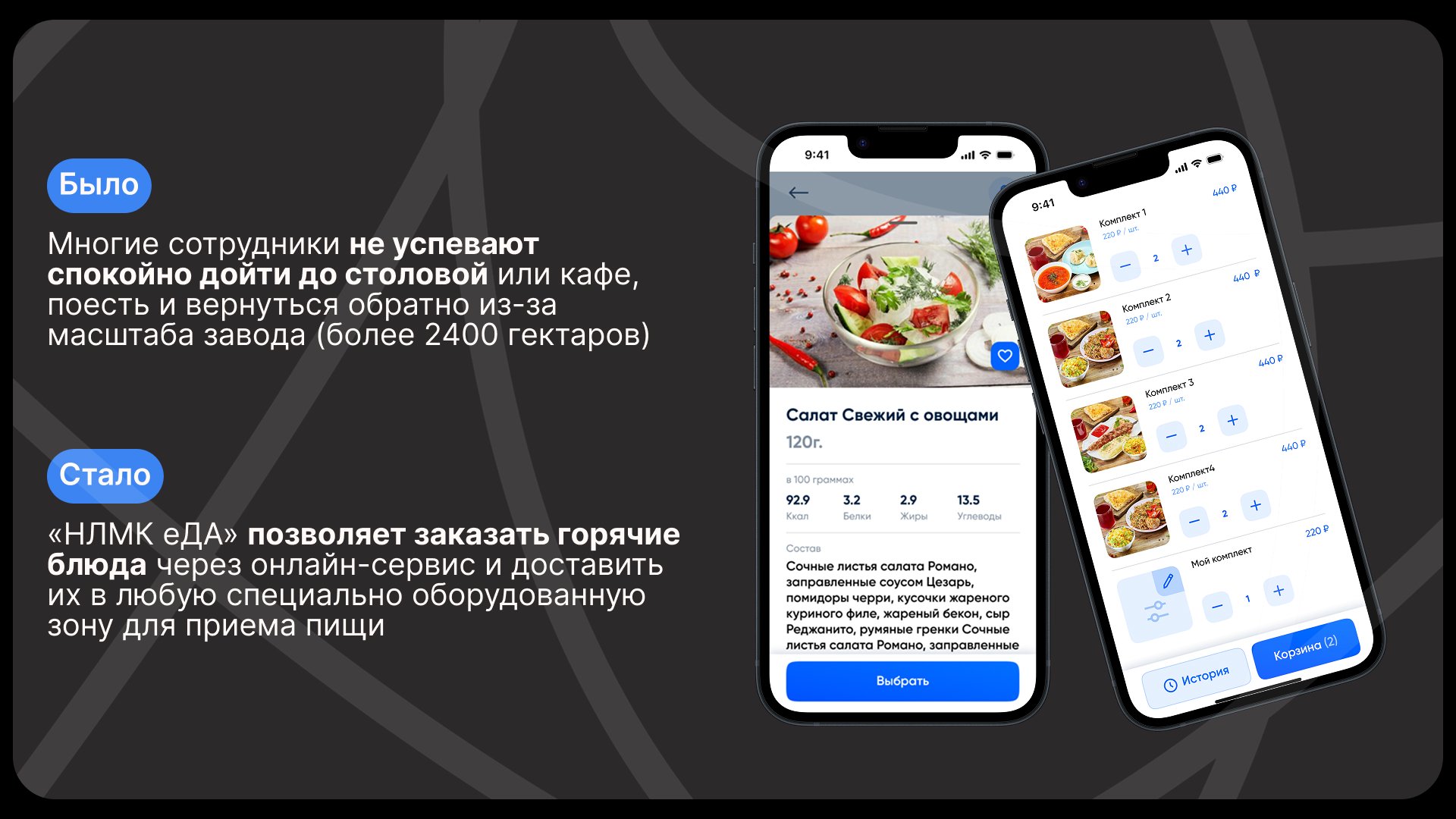 Мы разработали мобильное приложение, которое позволяет сотрудникам заказывать горячие блюда онлайн с доставкой в ближайшие зоны приема пищи. Приложение также позволяет оплачивать еду за счет льгот компании или личных средств. Так благодаря порталу НЛМК еДА и мобильному приложению доступ к питанию получили работники, ранее не имевшие такой возможности, например, 1500 представителей карьера АО «Стойленский ГОК».