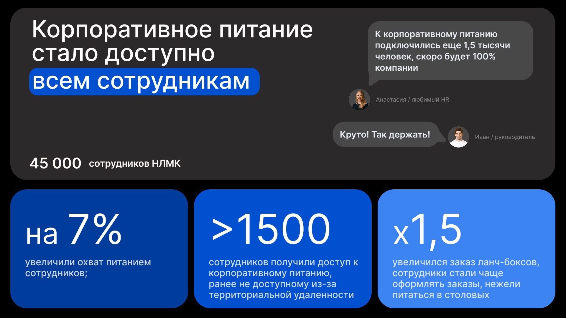 Программа корпоративного питания на портале НЛМК еДА и мобильное приложение позволили организовать быстрый доступ к питанию для сотрудников, работающих в удаленных частях предприятия и тратящих много времени на дорогу к корпоративной столовой. Благодаря этому удалось добиться внушительных результатов: