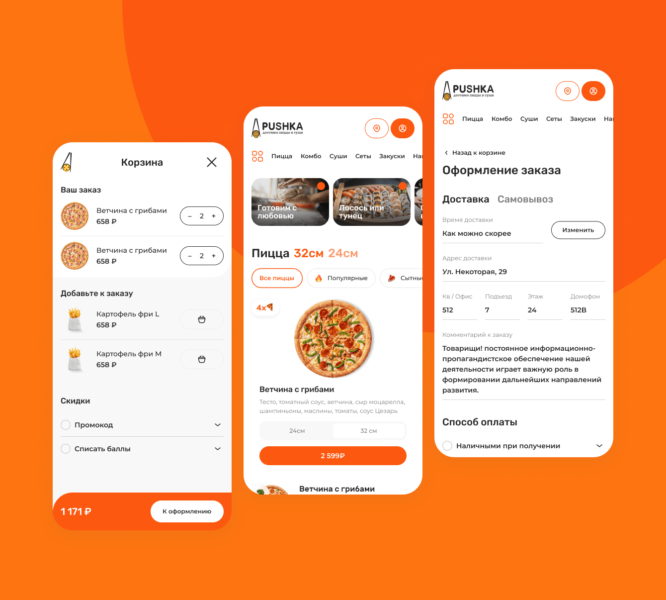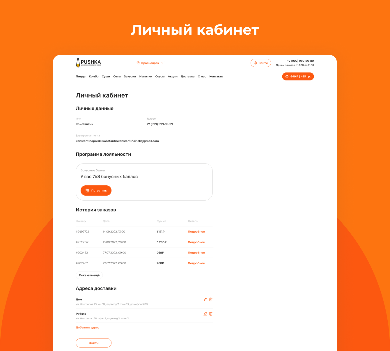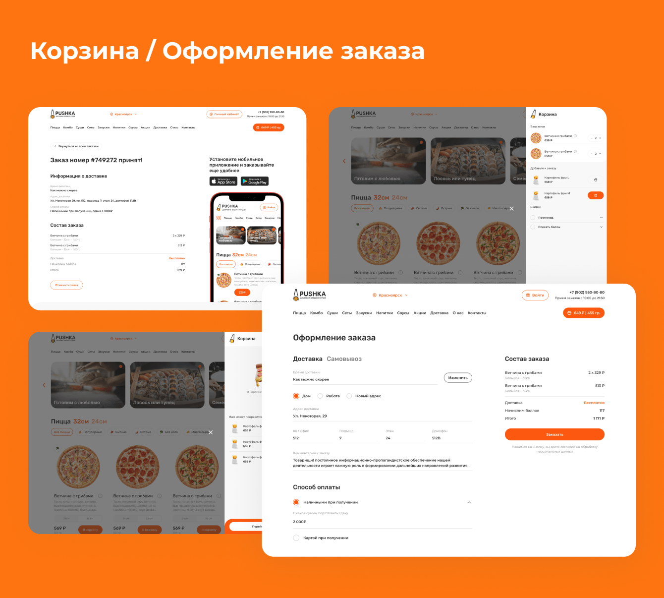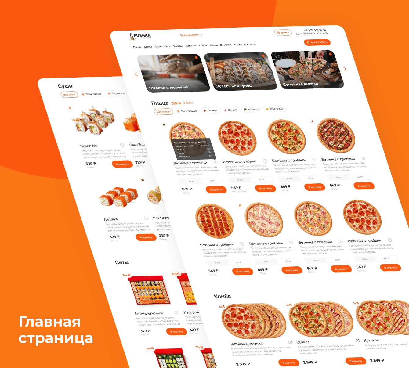 Клиент «Сушипушка Дивногороск» обратился к нам с задачей обновления своего сайта. Он хочет улучшить дизайн и функционал сайта, добавить новые страницы с меню, зонами доставки, акциями и отзывами клиентов, а также интегрировать онлайн-заказ еды для удобства пользователей. Кроме того, клиент требует обеспечения сайта высокой скоростью загрузки, безопасности данных и удобной навигации пользователя. Еще была необходимость в мобильном приложении на базе Android и IOS