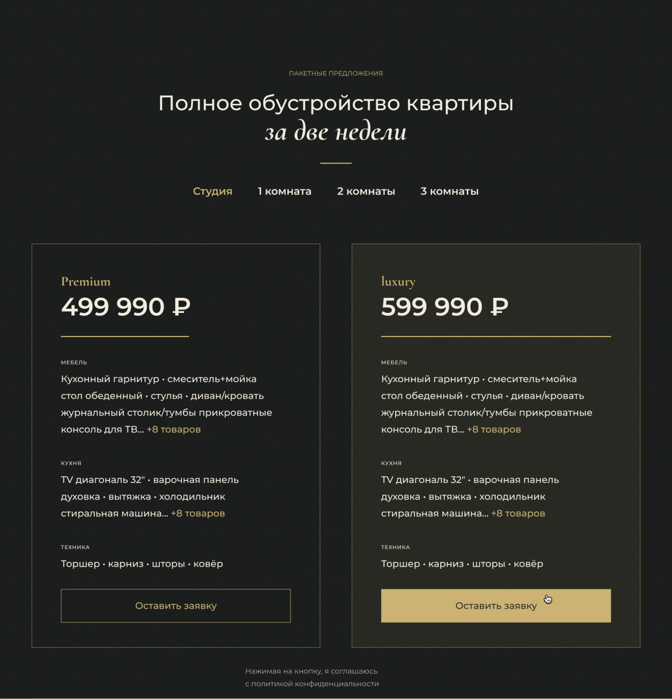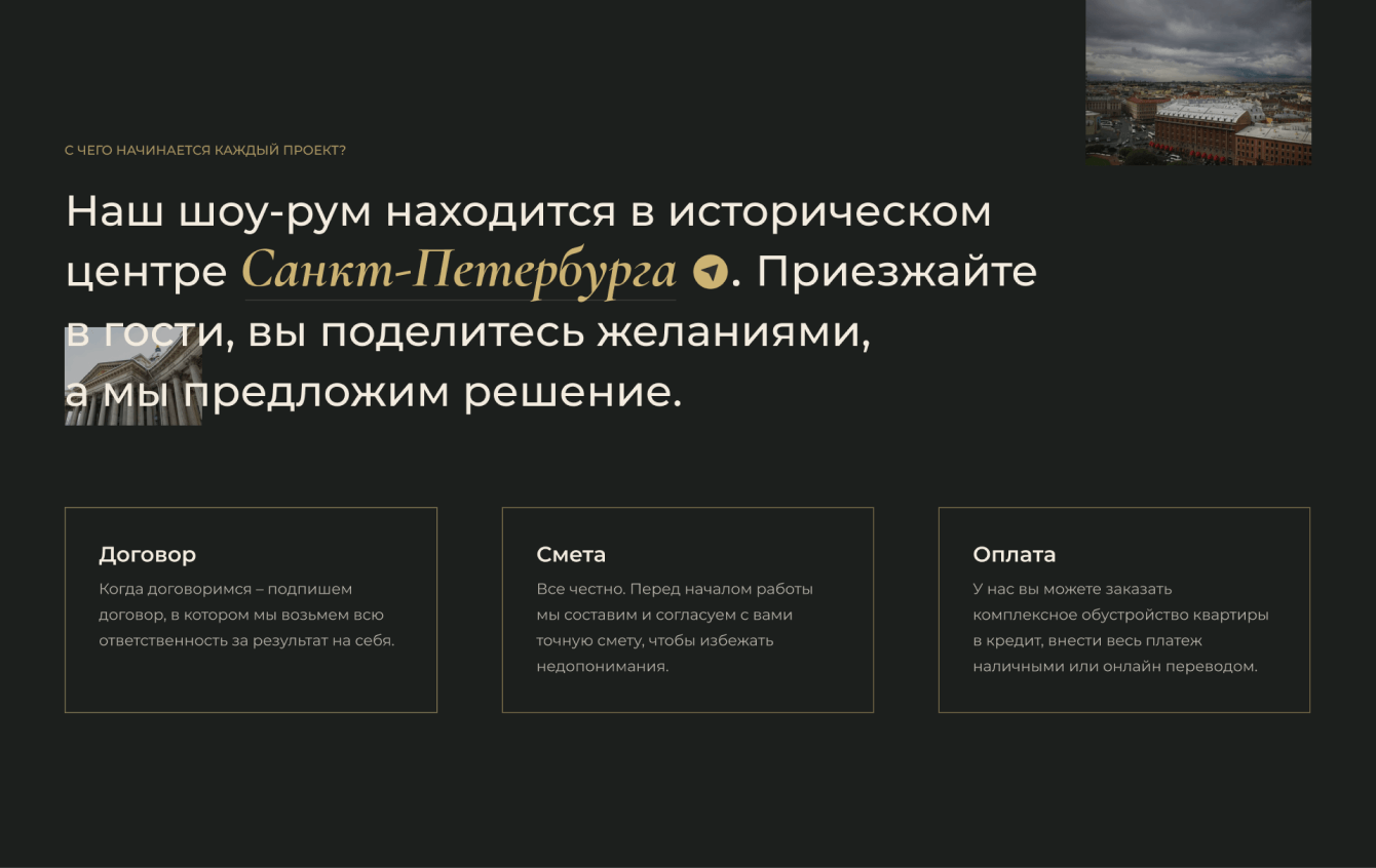 Дальше — сайт. Его текст отвечает на главные вопросы обеспеченных клиентов: «Что я получу? Насколько быстро? Сколько это стоит?». В формулировках мы обошлись без воды вроде «эксклюзивный», «элитный» и «лакшери».
