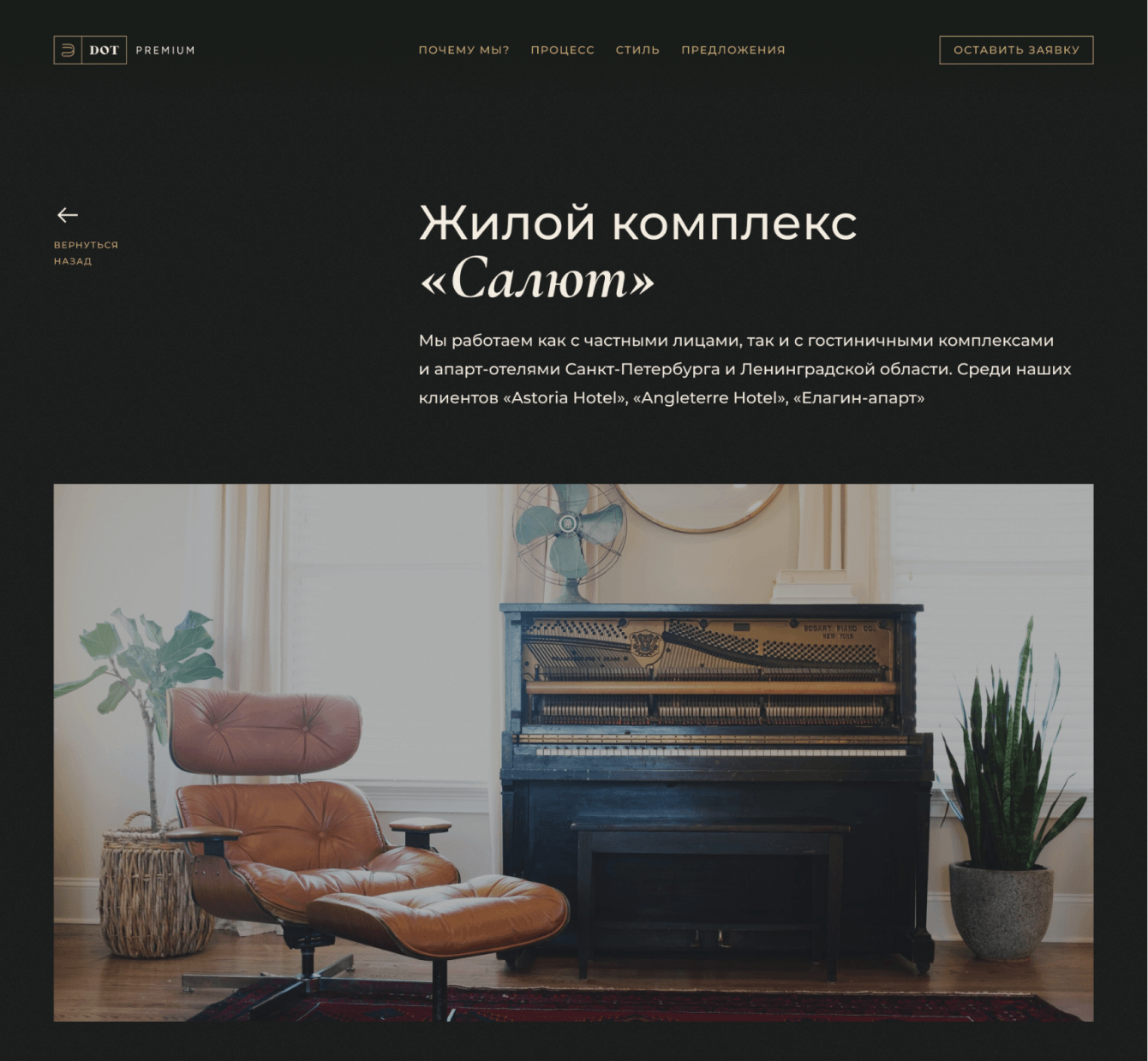 В феврале 2020 года к нам обратилась компания, которая обустраивает квартиры и гостиничные комплексы под ключ. Клиент запустил новое направление — сервис по созданию интерьеров премиум-класса. Для него нужно было спроектировать логотип и собрать лендинг на Тильде.