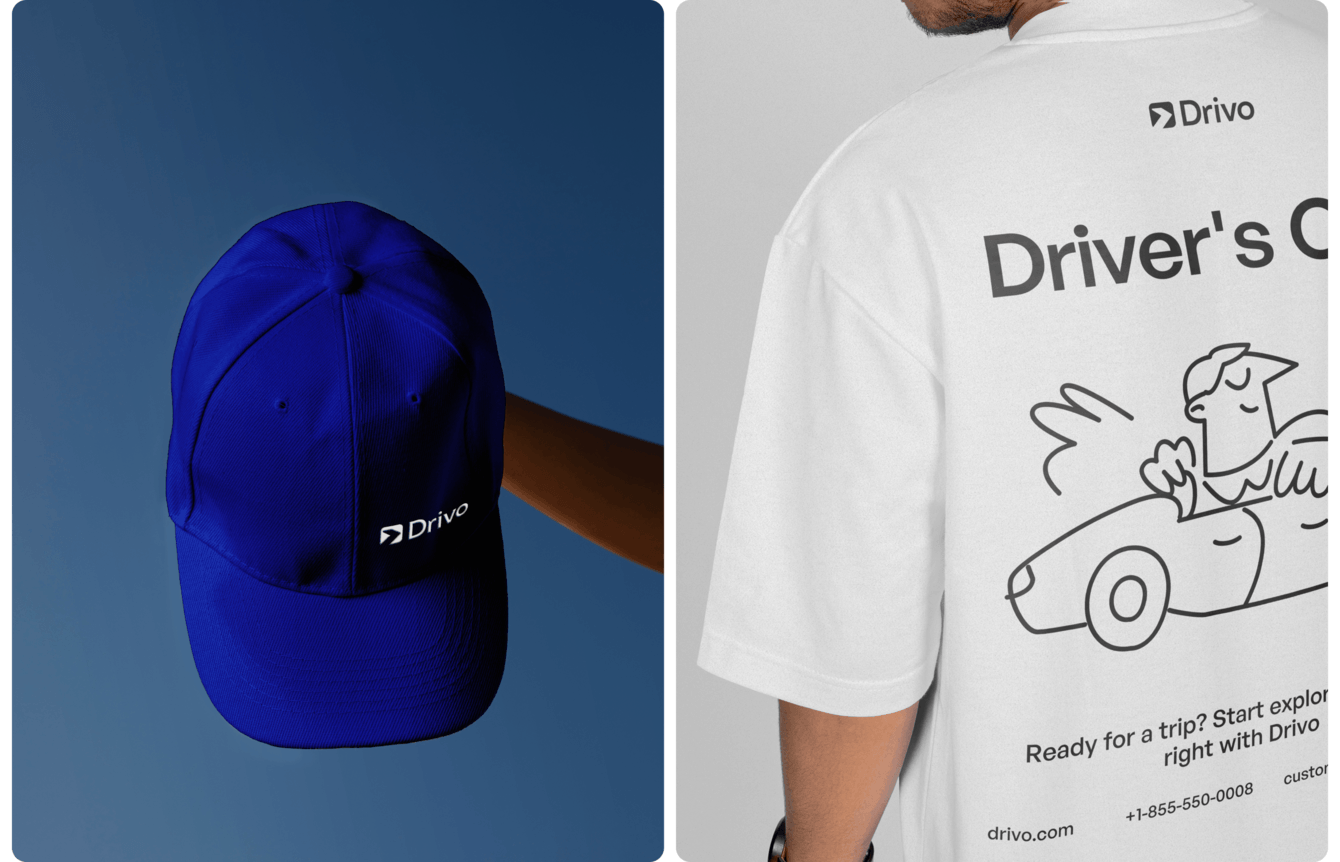 5. Мерч и оффлайн-коммуникации: мы продумали форму сотрудников, брендированный мерч и полиграфию, чтобы каждая деталь транслировала характер Drivo.