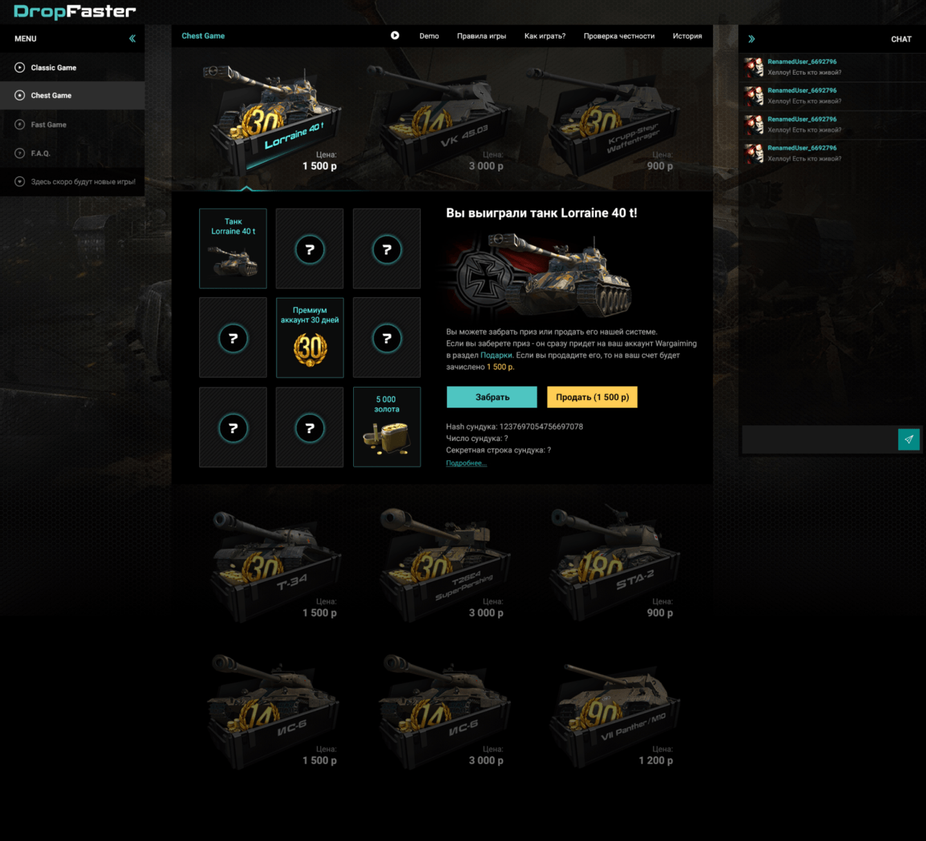 Разработали сайт на React.js и Node.js с честным выбором победителя или выигрыша, где пользователь может проверить честность. Также разработали бота для покупки предметов на сайте Wargaming.