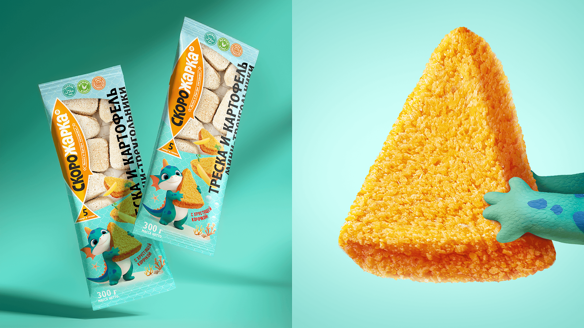 Бренд «Скорожарка» не противоречит более детскому позиционированию продуктовой линейки: яркая айдентика с «активным» шрифтом и динамичными клеймами выделяется среди более классических конкурентов и привлекает внимание.