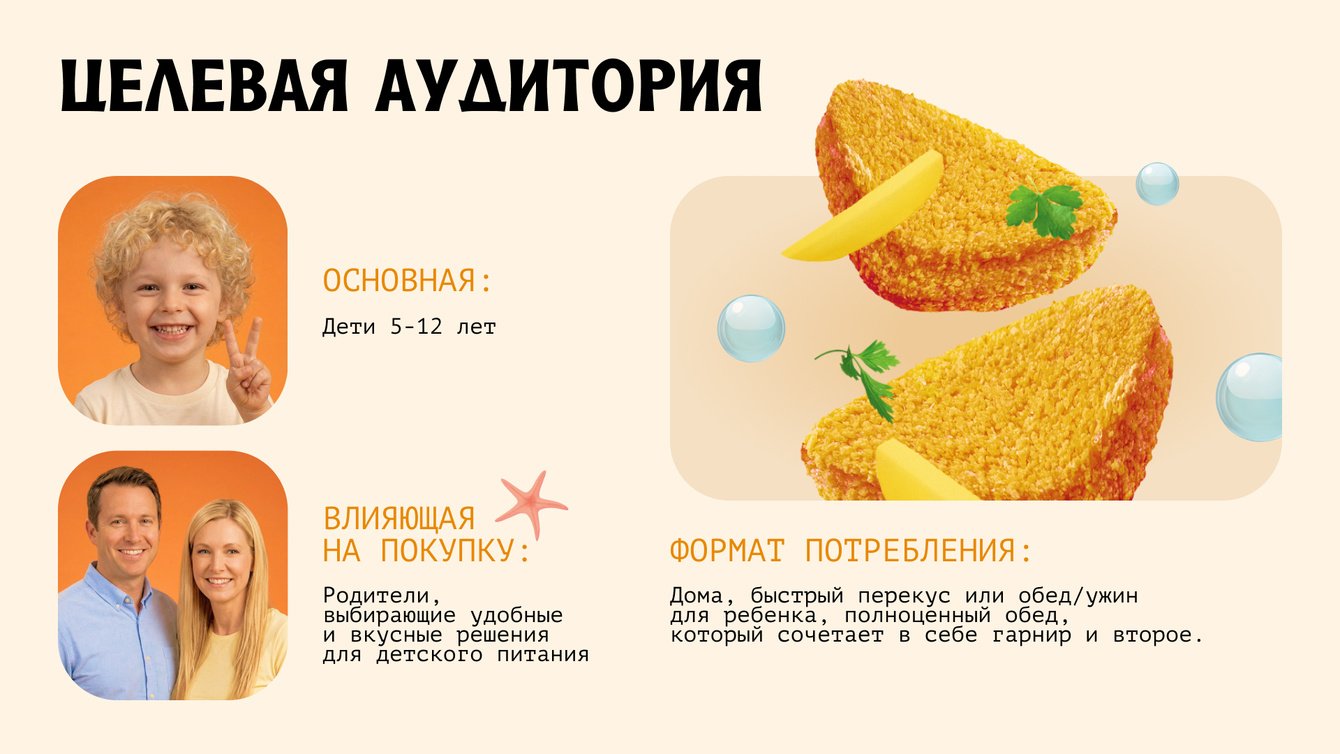 В визуальном имидже суббренда акцентный персонаж сочетается с крупной узнаваемой бренд-зоной, клеймом «с хрустящей корочкой» и динамичной, словно движущейся фудзоной. Это создает эффект мультфильма и интерактивности: наггетс хочется поймать и скорее съесть.
