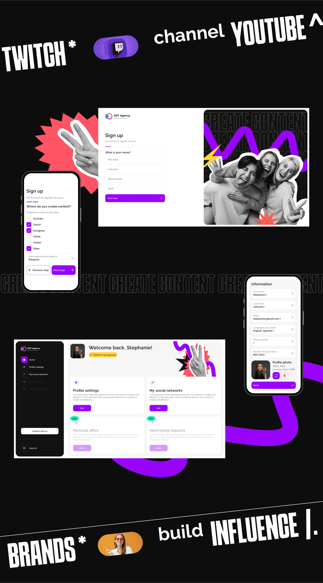 Вместе с DST Agency мы создали не просто сайт, а digital-пространство, объединяющее инфлюенсеров и бренды. Это проект, который вдохновляет, упрощает взаимодействие и делает монетизацию креативного контента доступной.