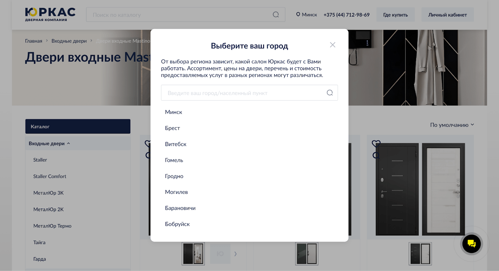 Выбор города на сайте влияет не на каталог, а только подставляет нужные контактные телефоны и передает заявку в CRM с указанным городом. Каталог при этом остается общим — без фильтрации под локальный ассортимент.