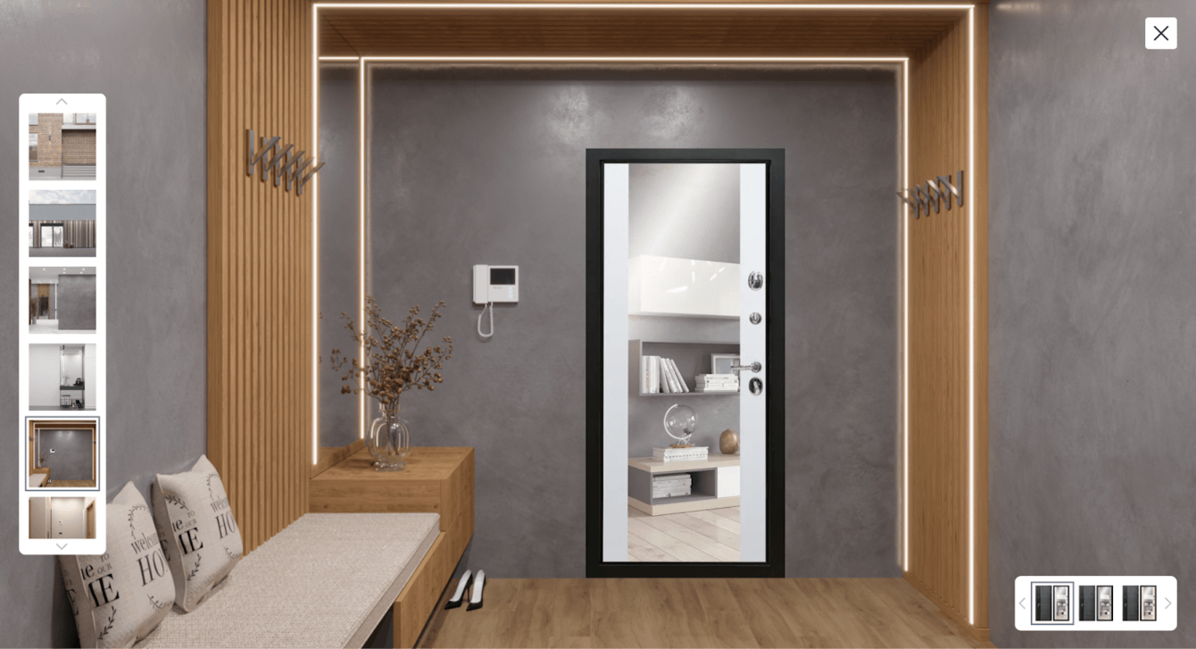 Теперь дверь можно примерить к интерьеру и сразу понять — сидит или нет. Разработали отдельный модуль, который позволяет переключаться между изображениями дверей и смотреть, как они выглядят в реальных интерьерах.