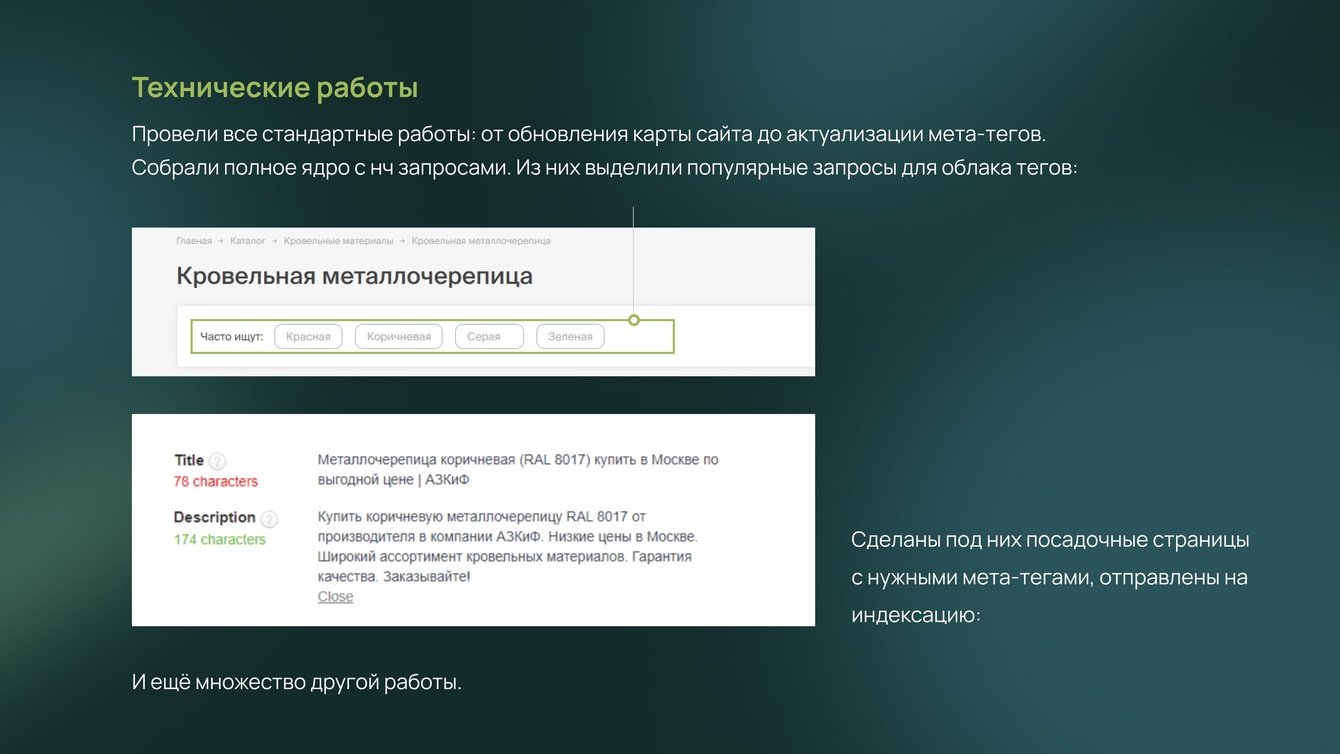При проработке всех категорий стал появляться результат. Вышли в ТОП запросы “купить кровлю”, “купить материалы для крыши”, “купить кровельный профлист”, “купить профлист для забора” и т.д