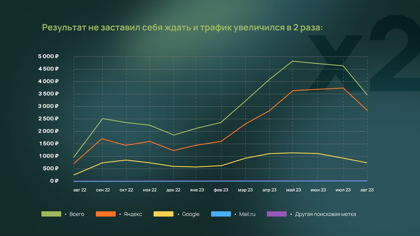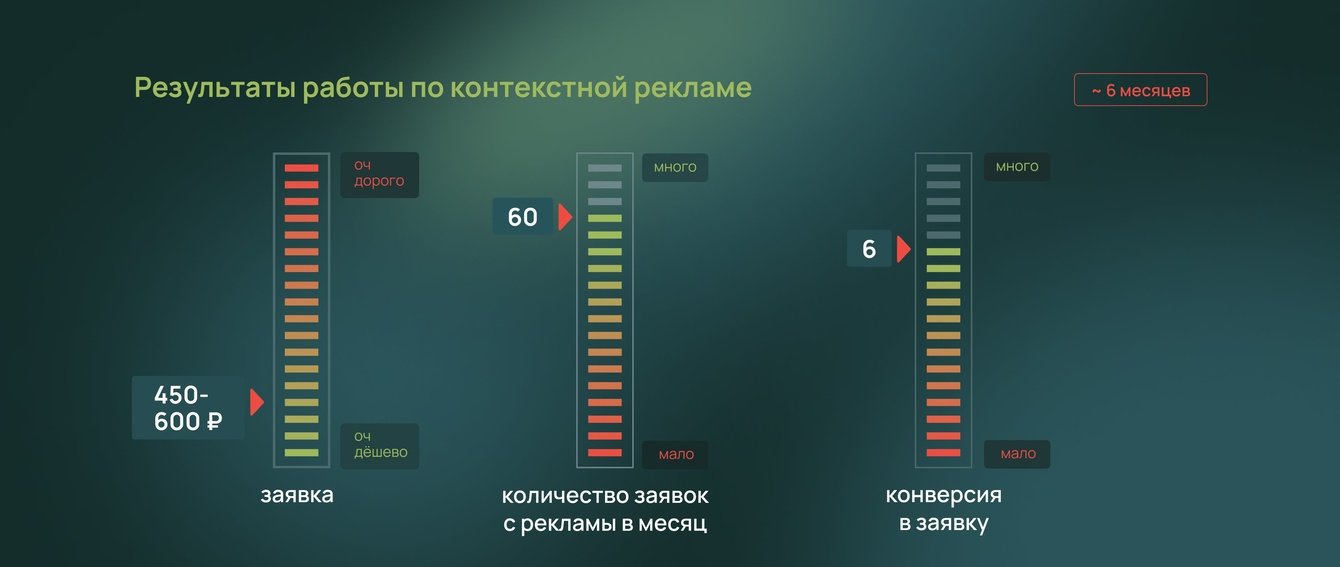 По SEO мы увеличили трафик в 2 раза, а блогодаря работе с юзабилити сайта мы достигли цену заявки ниже в 10 раз - с 4500 рублей в 450!