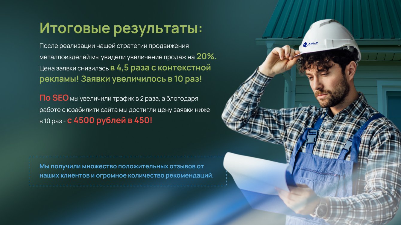 После реализации нашей стратегии продвижения металлоизделей мы увидели увеличение продаж на 20%. Цена заявки снизилась в 4,5 раза с контекстной рекламы! Заявки увеличилось в 10 раз!