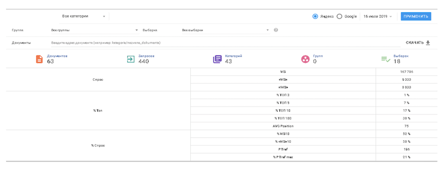 Старт работ: Июль 2019 года. На старте было собрано семантическое ядро объемом 400+ запросов. На момент начала работ — июль 2019 года, мы имели всего 17% запросов в ТОП-10, более того — в ТОП-100 находилось всего 30% запросов, при средней позиции 75: