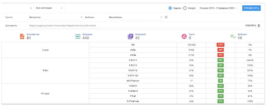 Динамика основных типов показателей. Спустя семь месяцев работ по поисковой оптимизации мы смогли добиться следующих результатов: