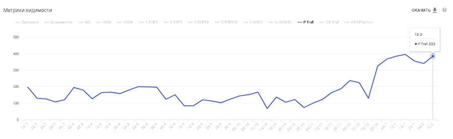 Количество посетителей сайта выросло более, чем в 2 раза, с 854 до 1800 за месяц. Тут мы видим очевидную корреляцию трафика с показателем Ptraf (При росте Ptraf в два раза, трафик также увеличился в 2 раза):