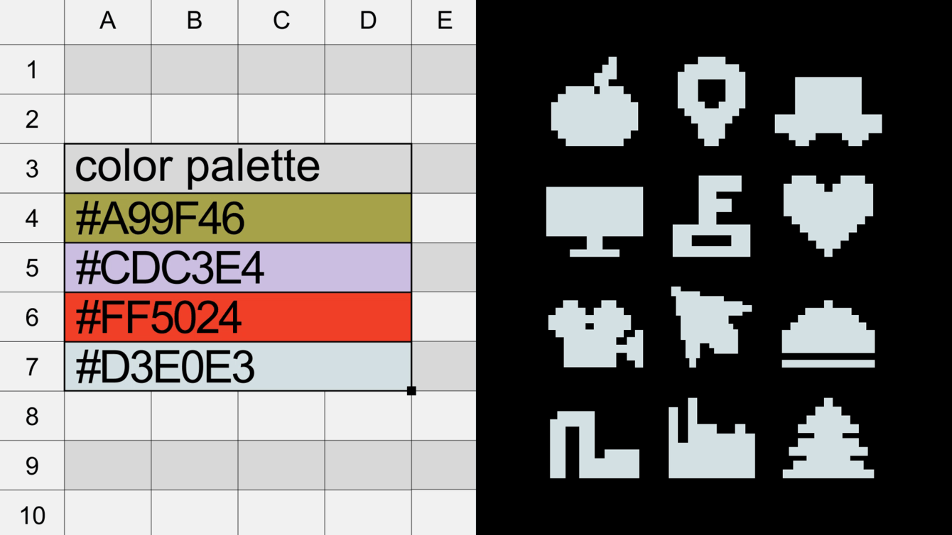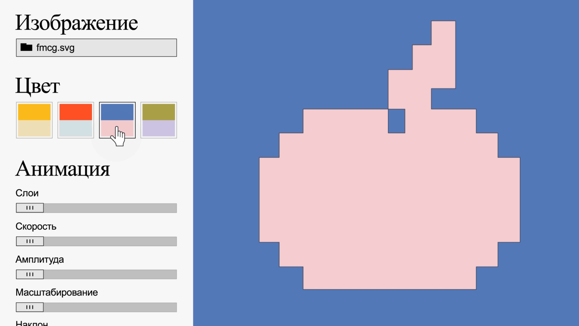 Цветовая палитра также вдохновлена таблицам и диаграммами — основными инструментами исследователей и маркетологов. Работа с большими данными передана через генеративный инструмент, в котором бесконечное количество раз повторяется иконка. Есть настройки скорости, амплитуды, масштабирования, количество слоев и тд, что дает возможно гибко и разнообразно создавать новый контент.