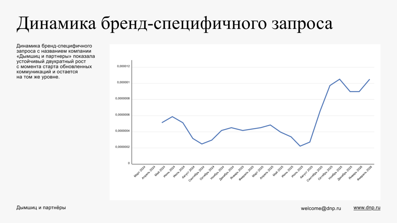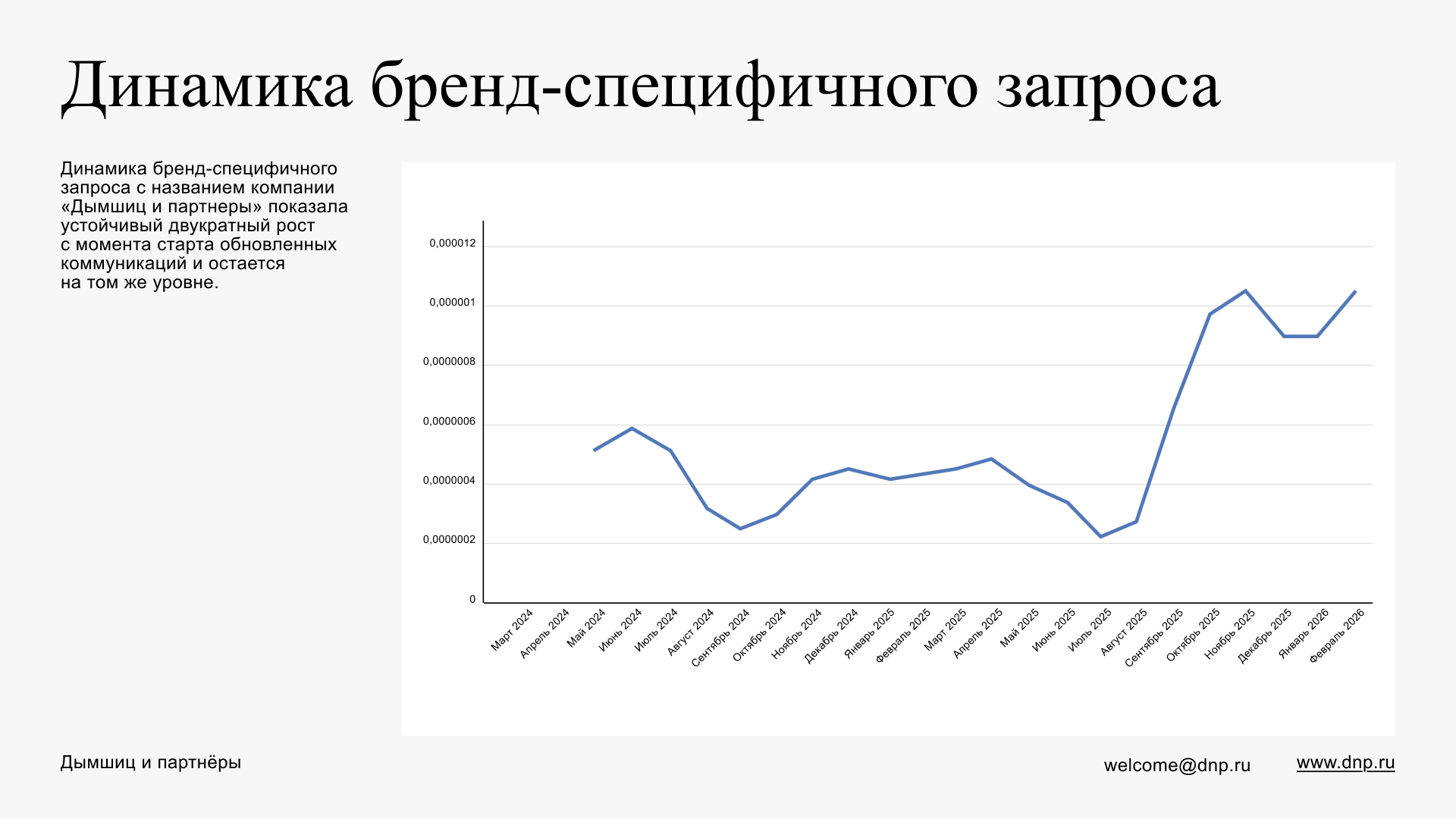 На рынке сложных B2B-продуктов финансовые результаты ребрендинга становятся устойчиво заметными спустя один-два бизнес-цикла, но эффективность проекта с точки зрения «заметности» бренда на рынке можно увидеть быстрее. Динамика бренд-специфичного запроса с названием агентства показала устойчивый двукратный рост с момента старта обновленных коммуникаций и остается на том же уровне. Компания выиграла несколько конкурсов за лучший дизайн и доказала, что корпоративный бренд может и должен быть ярким и смелым.
