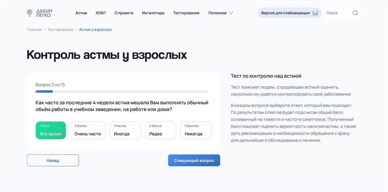 Для удобства навигации применили цветовое кодирование — синий для астмы и зелёный для ХОБЛ. А чтобы сайт оставался доступным для всех, предусмотрели версию для слабовидящих пользователей.