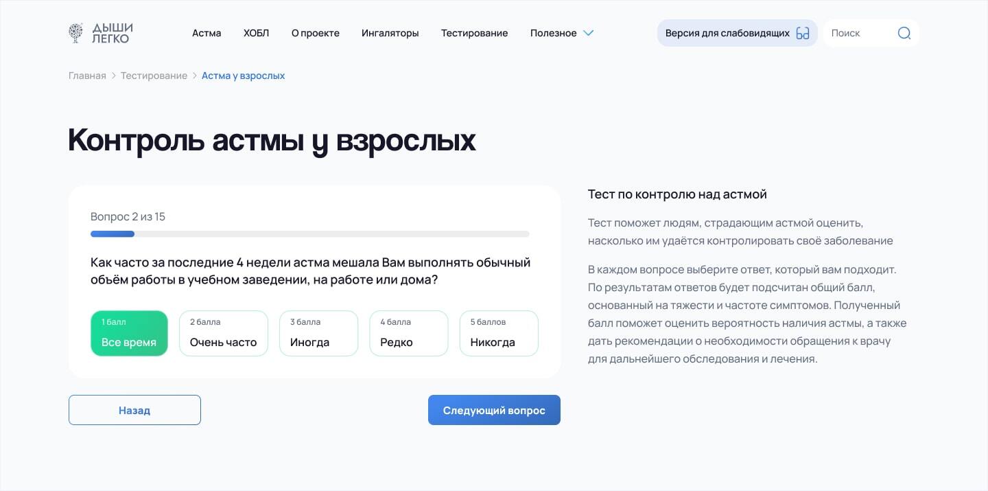 — добавить интерактивные элементы, чтобы сайт не был просто «о чтении», а позволял вовлекать пользователя — например, через дыхательные гимнастики и тесты по контролю заболевания;