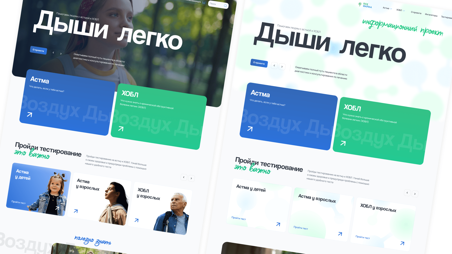 Для удобства навигации применили цветовое кодирование — синий для астмы и зелёный для ХОБЛ. А чтобы сайт оставался доступным для всех, предусмотрели версию для слабовидящих пользователей.