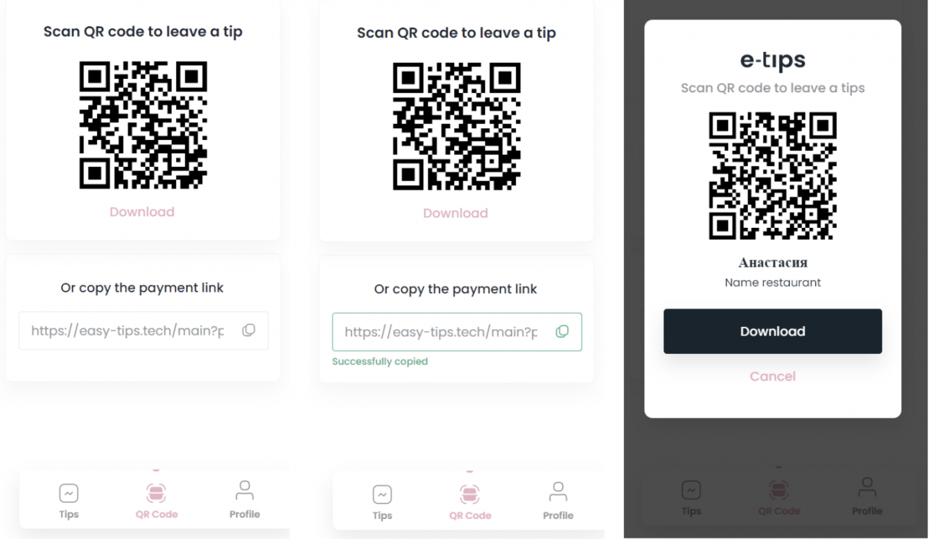 Приложение генерирует уникальный QR-код, который возможно отсканировать с помощью любого смартфона или планшета с камерой. После того, как QR-код отсканирован, человек будет перенаправлен на страницу, где сможет оставить свою благодарность официанту.