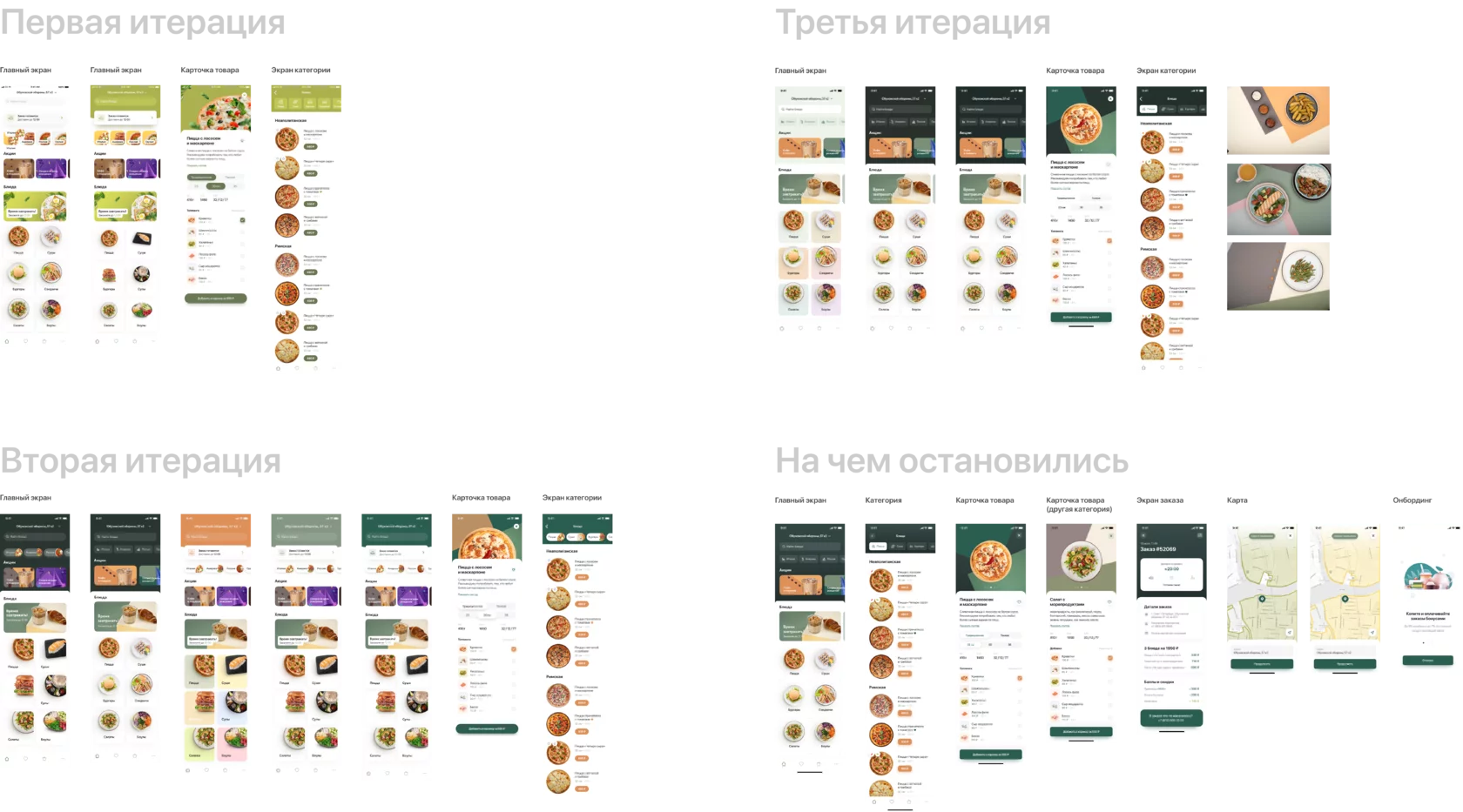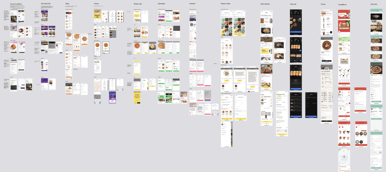 Мы собрали доску с примерами других приложений доставок и совместно с клиентом выбирали какие решения нам нравятся, а какие не нравятся.