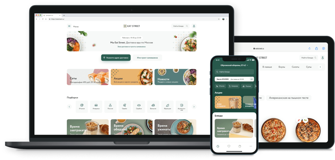 Сайт и приложения EatStreet, интеграция с iiko, retailCRM, различными системами аналитики и сторонними сервисами.
